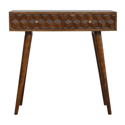The main feature of this console table is the hand carved cube drawer fronts which make the pieces from this collection stand out. It has been constructed from 100% solid mango wood in a chestnut finish, features 2 drawers for extra storage, and stands on 4 Nordic style legs. It can be partnered with the other pieces from the range or stand individually as its style is versatile and can fit into different types of interiors.