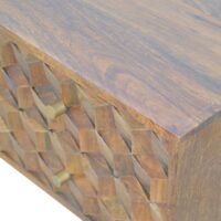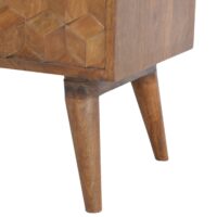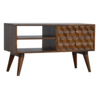 The main feature of this media unit is the hand carved cube drawer front which make the pieces from this collection stand out. It has been constructed from 100% solid mango wood in a chestnut finish, it features 2 open slot for extra storage and stands on 4 Nordic style legs. It can be partnered with the other pieces from the range or stand individually as its style is versatile and can fit into different types of interiors.