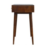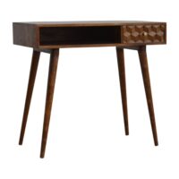 The main feature of this writing desk is the hand carved cube drawer front which makes the pieces from this collection stand out. It has been constructed from 100% solid mango wood in a chestnut finish, features 1 open slot for extra storage, and stands on 4 Nordic style legs. It can be partnered with the other pieces from the range or stand individually as its style is versatile and can fit into different types of interiors.