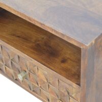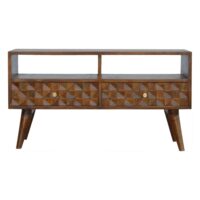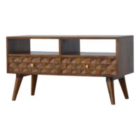 The main feature of this media unit is the hand carved diamond drawer front which makes the pieces from this collection stand out. It has been constructed from 100% solid mango wood in a chestnut finish, it features 2 open slots for extra storage and stands on 4 Nordic style legs. It can be partnered with the other pieces from the range or stand individually as its style is versatile and can fit into different types of interiors.