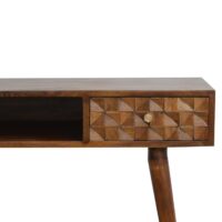 The main feature of this writing desk is the hand carved diamond drawer front which makes the pieces from this collection stand out. It has been constructed from 100% solid mango wood in a chestnut finish, features 1 open slot for extra storage, and stands on 4 Nordic style legs. It can be partnered with the other pieces from the range or stand individually as its style is versatile and can fit into different types of interiors.