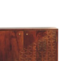 This Chestnut Dice Cabinet has been inspired by a clean and modern design. It has been constructed from 100% solid mango wood in a chestnut finish and features 2 doors that have a fading dice pattern that blends beautifully with the grain pattern of the wood. Other features include chunky ball feet and shiny knobs.