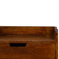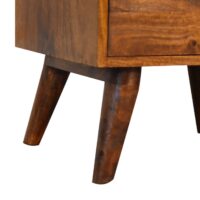 This gallery back bedside table is the perfect stand for any bits and pieces you wish to keep nearby before bedtime. It features ample space for a lamp, photo frame or any ornaments. It has been constructed from 100% solid mango wood with a chestnut finish body. Some other product characteristics are 4 Nordic solid wood legs and cut-out slots for easy access to and from the drawers. Its simple and clean design is the ideal piece of furniture for both country homes as well as modern apartments.