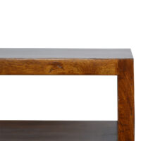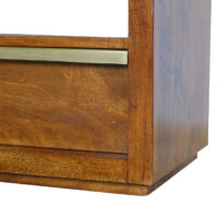 Add this media unit to your home, featuring a clean-cut design with an open slot and 1 pull-out drawer with a golden bar handle. The piece can stand alone beautifully or be partnered with the other pieces from the range. It has been constructed from 100% solid mango wood and has been finished in a rich light chestnut colour giving the piece a nice contrast between the gold metal and wood. It has ample space for a TV, any ornaments, or photo frames. The perfect addition to modern homes and compact city apartments.