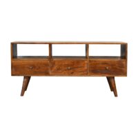 Our solid timber media unit is expertly constructed from 100% solid mango wood, in a fine chestnut finish. This beautiful Nordic wood style unit features a decent-sized table top, 3 open slots and 3 drawers for displaying and storing things such as plants, pictures frames or ornaments.