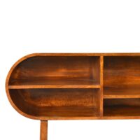 This round style media unit has been constructed from 100% solid mango wood in chestnut finish. It features 2 open slots and 2 drawers which provide great storage and will come in handy in the living room. Some other features include 4 Nordic style legs and shiny knobs on the drawers. It can be used alone or be partnered with the other rounded furniture pieces from the collection.