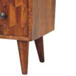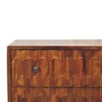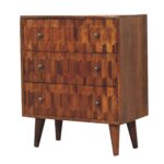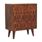 This multi-utility chest of drawers has been constructed from 100% solid mango wood and has a chestnut finish. Its unique design offers useful storage space with 3 large spacious drawers to take care of everyday utility items. It features shiny knobs, 4 Nordic style feet, and mainly the beautiful pineapple hand carved design on the drawers giving the product a unique look. It will add a definite and lasting character to any home space or living room.