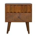 Enjoy the beauty of this bedside in your bedroom, constructed from 100% solid wood in a chestnut finish. It features 4 tapered handcrafted legs and two deep drawers to take care of everyday utility items. The main feature is the hand carved raised prism drawer front. This bedside adds a nice touch and lasting character to your bed or living room.