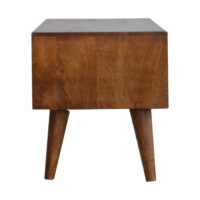 This media unit has been constructed from 100% solid mango wood in a chestnut finish and features 1 open slot and 1 hand-carved sliding door which features a raised prism design. It also features 4 Nordic-style legs which complement the body nicely and give the entire piece a contemporary look. The perfect addition to the home.