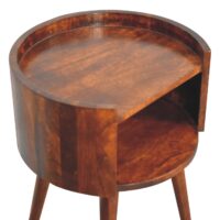 This round style bedside has been constructed from 100% solid mango wood and has an open design, perfect for stroring or displaying any bits and pieces before bedtime. It has been constructed from 100% solid mango wood in a chestnut finish allowing its simple design to be able to be partnered with any styles or finishes of furniture.
