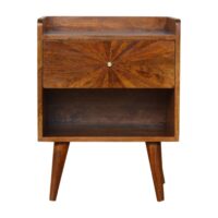 For storing bits and pieces before bedtime, this piece of furniture will prove handy all over your home. It is constructed from 100% solid mango wood in a chestnut finish and has a sunrise pattern on the drawer front. It features 4 nordic style legs and a shiny candle knob along with 4 nordic style legs. This bedside is bound to be the perfect partner for your bed.