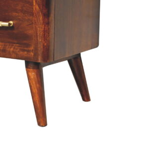 Introducing our Chestnut T-Bar Nordic Chest, this eye-catching chest is crafted from 100% solid mango wood with a chestnut finish. Its features include 3 spacious drawers, Nordic-style legs, and 6 shiny gold t-bar handles. It’s the ultimate blend of style and functionality. Elevate your bedroom with this essential and elegant piece and conveniently use it to store your clothes.