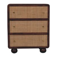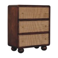 Introducing the Chestnut Woven Chest with three sleek drawers, a modern twist on classic storage. Crafted with woven fronts and solid mango wood legs, it exudes rustic charm with a contemporary edge. Each drawer features 2 shiny knobs for a touch of elegance. Versatile and stylish, it’s perfect for any room in your home.