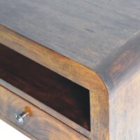 Inspired by our curved range, this chunky wall-mounted unit has been constructed from 100% solid mango wood in a chestnut finish and features 1 drawer with a shiny knob along with 1 open shelf for storing any bits and pieces you wish to keep close by before bedtime. It’s neat and clean design can easily be mounted on the wall without the fuss of any legs. Caution! Do not sit on the unit.