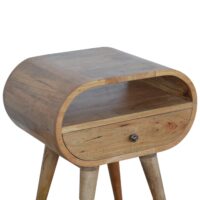 This round style bedside has been constructed from 100% solid mango wood and has one drawer with an open slot, perfect for storing or displaying any bits and pieces before bedtime. It has been constructed from 100% solid mango wood in an oak-ish finish allowing its simple design to be able to be partnered with any styles or finishes of furniture.