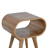 This round style bedside has been constructed from 100% solid mango wood and has an open design, perfect for storing or displaying any bits and pieces before bedtime. It has been constructed from 100% solid mango wood in an oak-ish finish allowing its simple design to be able to be partnered with any styles or finishes of furniture.