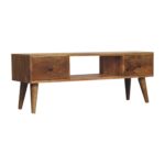 This coffee table offers a contemporary and versatile style of furniture for today’s modern interiors. It has been constructed from 100% solid mango wood in an oak-ish finish and finished with a clear lacquer making the product durable and able to withstand years of use. It also has 2 shiny brass knobs and 2 open slots for extra storage making it a perfect piece for the living room. This petite product is a part of Recession Collection.