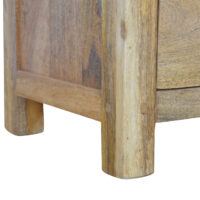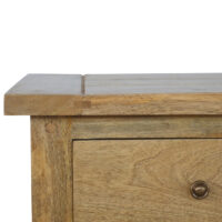 Standing by your bed, this bedside gives you easy and convenient storage for: books, a glass of water or a phone. This three drawer bedside will add warmth and character to your space. Beautifully made from 100% solid mango wood with a fine oak-ish finish; its clean and elegant lines give a timeless appearance. This product is artistically handcrafted in a country style using wooden pegs, grooves and bread board joints. Other features include 3 drawers, straight farm house feet and shiny round knobs.