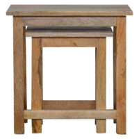 This set of two Nesting stools have been constructed 100% mango wood in an oak-ish finish and are perfect for providing extra seating for guests or for everyday use. These strong stools are functional and easy to tuck away when not in use. The stools also work as side tables providing excellent versatility. Each stool is individually hand distressed for a unique look meaning no two pieces are identical. Every piece of furniture is individually handcrafted and includes swing care tickets explaining the cautions and aftercare instructions.