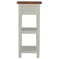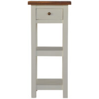 This 2 toned telephone table has a white hand spray painted base with a rich honey finish top. The base of the telephone table is constructed from solid mango wood and the top is constructed from solid acacia wood. It comes with one drawer and 1 shelves, other features include round knobs, straight farm house legs and the inner of the drawer has a rich honey finish.