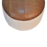Derived from the French word for ‘curled’ or ‘ringed’ yarn or fabric. This handwoven upholstered round footstool is made of 100% cotton and natural yarn, combining a buffalo hide leather seat and round ball feet constructed from 100% solid mango wood in an oak-ish finish for added contrast.
