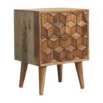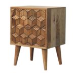 Introducing the Cubana bedside, it is endlessly versatile and will prove handy in your bedroom. It has been constructed from 100% solid mango wood and has a smooth oak-ish finish with a cubed carved design on the drawer fronts. It also features shiny knobs and has 4 Scandinavian-styled legs.