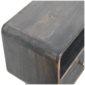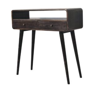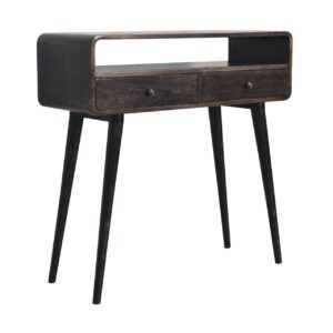 This simple, elegant console table has beautifully curved edges to fit perfectly in any living space, this 100% solid mango wood unit has been built with sustainably sourced timbers and has two drawers and 1 open slot to help you keep your home organized and storing any little household objects. It has shiny knobs and has a fine ash black finish with 4 Nordic style legs.