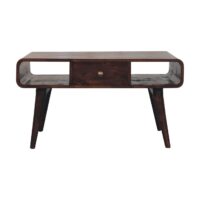 This Coffee Table offers clean, curved edges and has been constructed from 100% Solid Mango Wood in a rich,california walnut finish. Some features include 2 drawers that have a shiny knob, 2 open slots to place any books, photo frames or ornaments and stands on 4 Nordic style legs.
