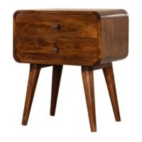Endlessly versatile, this bedside table makes a perfect stand for nibbles, drinks, or a lamp. It is made from 100% solid mango wood in a fine chestnut finish and has nordic style legs. It has curved edges which will fit into any home/living space. Cable access is provided which allows you to plug in any electronic device with no fuss.