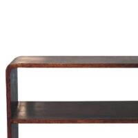 This charming rounded low bookcase is a gorgeous addition to your home. Made from 100% solid mango wood in a chestnut finish, it has shiny brass knobs on both drawers. Ample shelving space invites you to display your favorite books and treasures. Complete with sleek Nordic-style legs, this bookcase effortlessly combines style and functionality.