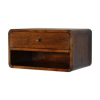 Inspired by our curved range, this minimalist wall mounted unit has been constructed from 100% solid mango wood in a chestnut finish and features 1 drawer with a shiny knob along with 1 open shelf for storing any bits and pieces you wish to keep close by before bedtime. It’s neat and clean design can easily be mounted on the wall without the fuss of any legs. Caution! Do not sit on the unit.