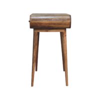 Introducing our stylish Writing Desk, crafted from solid mango wood. It’s sustainably sourced and comes in a beautiful chestnut finish. With one open slot and one drawer, it helps keep your space tidy. One shiny brass knob and and four Nordic-style legs add a touch of elegance. Perfect for work or study, this desk is a functional and attractive addition to your home or office.