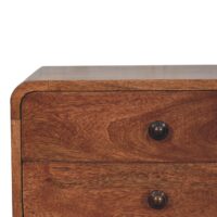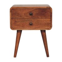 Endlessly versatile, this curved bedside table makes a perfect stand for nibbles, drinks, or a lamp. It will prove handy all over your home and is made from 100% solid mango wood and has a fine honey caramel finish. It has curved edges which will fit into any home/living space. It also comes with 2 drawers that come with shiny knobs and 4 Nordic-style legs.