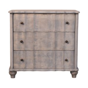 Handcrafted in an elegant Acid Wash finish, this timeless chest is made from 100% solid mango wood and features soft curved legs, rounded edges, and a classic three-drawer configuration. Each drawer is adorned with antique-style knobs, blending vintage charm with everyday practicality. A versatile piece perfect for bedrooms, entryways, or living areas, offering both refined aesthetics and generous storage.