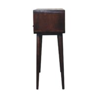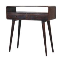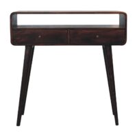 This simple, elegant console table has beautifully curved edges to fit perfectly in any living space, this 100% solid mango wood unit has been built with sustainably sourced timbers and has two drawers and 1 open slot to help you keep your home organized and storing any little household objects. It has shiny knobs and has a fine light walnut finish with 4 Nordic style legs.