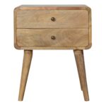 Endlessly versatile, this curved bedside table makes a perfect stand for nibbles, drinks, or a lamp. It will prove handy all over your home and is made from 100% solid mango wood and has a fine oak-ish finish. It has curved edges which will fit into any home/living space. It also comes with 2 drawers that come with shiny knobs and 4 Nordic-style legs.