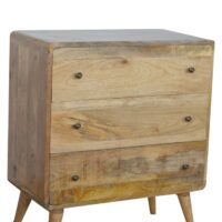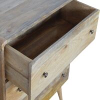 To match the other products from the curved collection, this chest of drawers has been constructed from 100% solid mango wood in a fine oakish finish and stands on 4 Nordic style legs. It features 2 shiny accent knobs on each drawer providing easy access when storing any clothes, towels, duvets etc. The curved design provides smooth, safe corners and gives the product a modern and contemporary look which is perfect for city homes and apartments.
