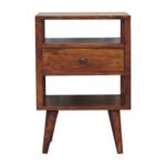 The Dante Bedside Table is ideal for adding a contemporary style to any bedroom. This small side table is perfect for maximizing space while staying on trend. It is constructed from 100% solid mango wood in a chestnut finish and nordic style legs.