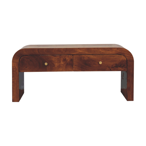 The rounded Darcy media unit, has a simplistic design which can be fitted into your living room and prove to be both a modern and handy item. Storage is available with 2 drawers which have shiny brass knobs and there is space on top for a TV, ornament or photo frame.