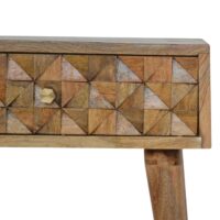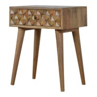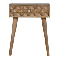 The main feature of this bedside table is the hand carved diamond drawer front which make the pieces from this collection stand out. It has been constructed from 100% solid mango wood in an oak-ish finish and stands on 4 Nordic style legs. It can be partnered with the other pieces from the range or stand individually as its style is versatile and can fit into different types of interiors.