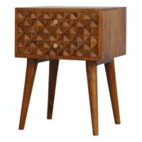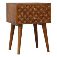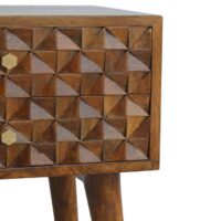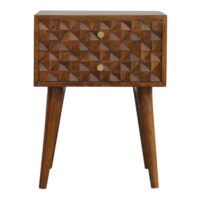 The main feature of this bedside is the hand carved diamond drawer fronts which make the pieces from this collection stand out. It has been constructed from 100% solid mango wood in a chestnut finish and stands on 4 Nordic style legs. It can be partnered with the other pieces from the range or stand individually as its style is versatile and can fit into different types of interiors.