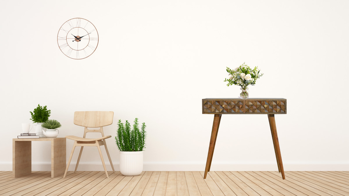 The main feature of this console table is the hand carved diamond drawer fronts which make the pieces from this collection stand out. It has been constructed from 100% solid mango wood in an oak-ish finish, features 2 drawers extra storage, and stands on 4 Nordic style legs. It can be partnered with the other pieces from the range or stand individually as its style is versatile and can fit into different types of interiors.