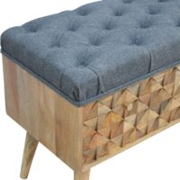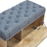 The main feature of this hallway shoe storage bench is the hand carved front door front which makes the pieces from this collection stand out. It has been constructed from 100% solid mango wood in an oak-ish finish, stands on 4 Nordic style legs, and has an upholstered grey tweed top. It can be partnered with the other pieces from the range or stand individually as its style is versatile and can fit into different types of interiors. Every piece of furniture is individually handcrafted and includes swing care tickets explaining the cautions and aftercare instructions.