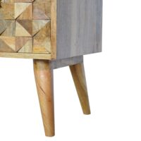 The main feature of this shoe storage hallway bench is the hand carved cube door front that makes the pieces from this collection stand out. It has been constructed from 100% solid mango wood in an oak-ish finish and stands on 4 Nordic style legs. It can be partnered with the other pieces from the range or stand individually as its style is versatile and can fit into different types of interiors. Every piece of furniture is individually handcrafted and includes swing care tickets explaining the cautions and aftercare instructions.