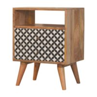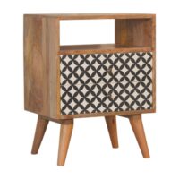This bedside has been constructed from 100% solid mango wood and finished in a fine oak-ish finish body. The main features of this piece are the screen-printed drawer fronts which have a beautiful, diamond design giving the piece extra dimension and character. Useful storage is provided with 1 open slot and 2 drawers to discreetly store any bits and pieces. It also has 4 Nordic-style legs and 4 shiny knobs.