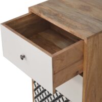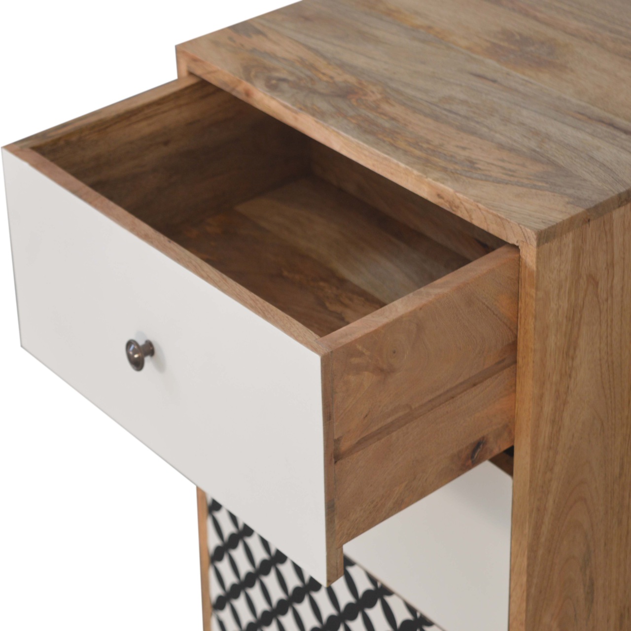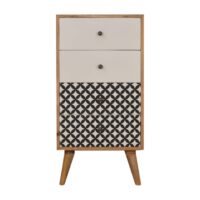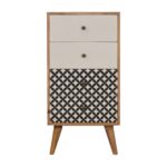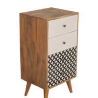 This tallboy has been constructed from 100% solid mango wood and finished in a fine oak-ish finish body. The main features of this piece are the 2 screen printed drawer