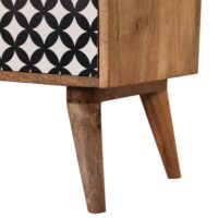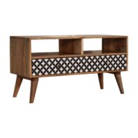 This media unit has been constructed from 100% solid mango wood and finished in a fine oak-ish finish body. The main features of this piece are the screen-printed drawer fronts which have a beautiful, diamond design giving the piece extra dimension and character. Useful storage is provided with all 2 open slots and drawers to discreetly store any bits and pieces. It also has 4 Nordic style legs and 2 shiny knobs.