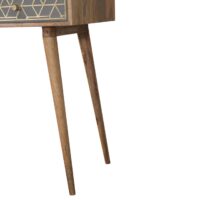 This writing desk has been inspired by a clean and modern design. It has been constructed from 100% solid mango wood in an oak-ish finish and features 1 open slot and 1 gold dice patterned drawer which blends beautifully with the grain pattern of the wood. Other features include nordic style legs and a shiny brass knob