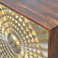 This Eden Cabinet is made of solid mango wood, with a chestnut finish structure. It has slots inside for convenient storage space and ample space on top to display ornaments, plants or photo frames. Additionally, the exquisite craftsmanship and beautiful gold brass sheet provide a beautiful carved pattern on the door fronts making this an all round eye-catching piece of furniture in your home.
