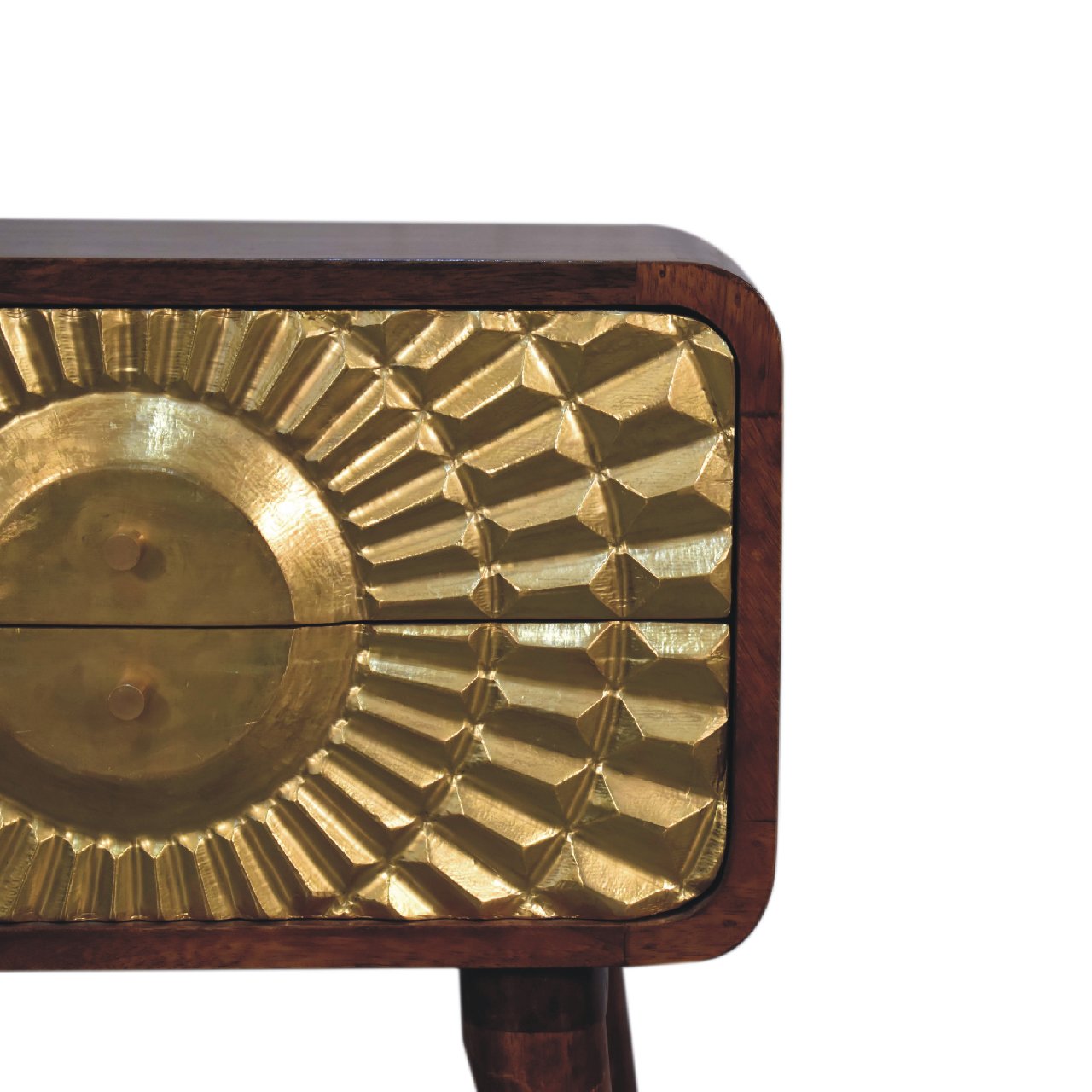 This Eden Curved Bedside is made of solid mango wood, with a chestnut finish structure. It has 2 curved spacious drawers for convenient storage space and ample space on top to display a photo frame, candle or lamp. Additionally, the exquisite craftsmanship and beautiful gold brass sheet provide a beautiful carved pattern on the drawer fronts making this an all-round eye-catching piece of furniture in your bedroom